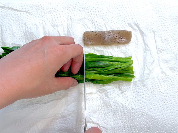3. 同じ鍋にニラを入れてサッと茹で、水気を切ったら、こんにゃくと同じ長さに切る。