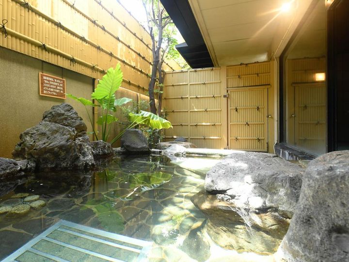 庭園の中にある岩風呂「紫水晶」は24時間入浴可能。無色透明・無臭でやわらかい泉質のアルカリ性単純泉。
