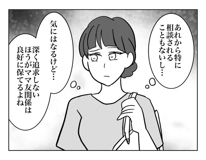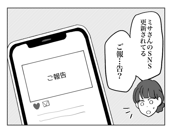 なにやらミサさん、元気のない様子です。ユキノさんはそんなミサさんの姿を心配そうに見つめています。でもママ友関係では相手からなにか言ってこない以上、こちらから深く追求しないほうがいいのかもしれません。そのうちなにかのきっかけで打ち明けてくれるかもしれないですしね。そんななかミサさんのSNSに突然の「ご報告」が上がったのでした。
