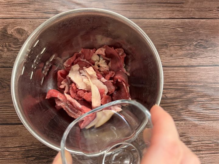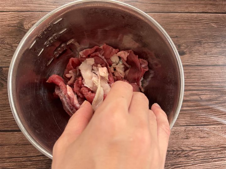 2. 牛肉に下味をつけます。ボウルに牛肉を入れ、[A]を加えて手で軽くもみ込みます。