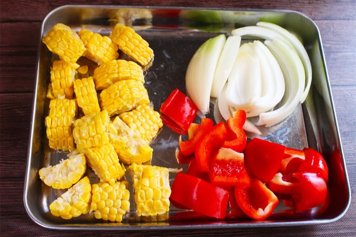 1. 野菜の下ごしらえをします。とうもろこしは皮とひげを除き、よく洗ってから軸をつけたまま1.5〜2cm幅の半月切りにします。赤パプリカはヘタと種を取り、ひと口大に切ります。玉ねぎは、1cm幅のくし切りにします。