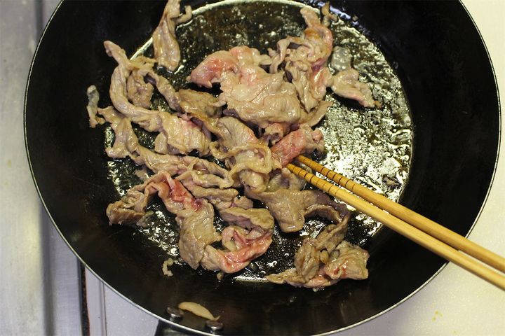 4. フライパンに油を強火で熱し、牛肉を炒めます。
