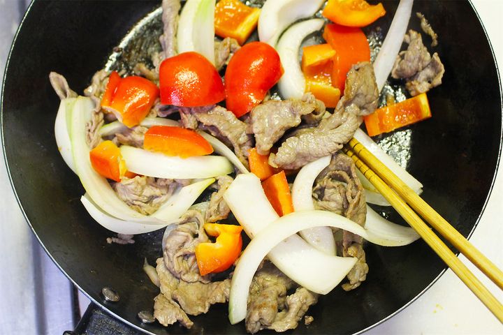 牛肉の色が変わるまで強火で手早く炒めましょう(フッ素樹脂加工のフライパンの場合は中火強で炒めてください)。