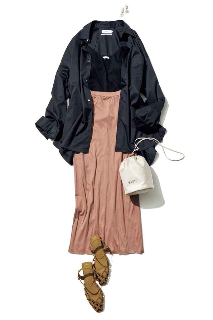 黒シャツは着まわし。キャミソール/ベイジ,(オンワード樫山 お客様相談室) スカート/blurhms(ワンダリズム) ピアス/BRANCH JEWELLERY(ZUTTOHOLIC) バッグ/VASIC(ヴァジックジャパン) サンダル/ダニエラアンドジェマ