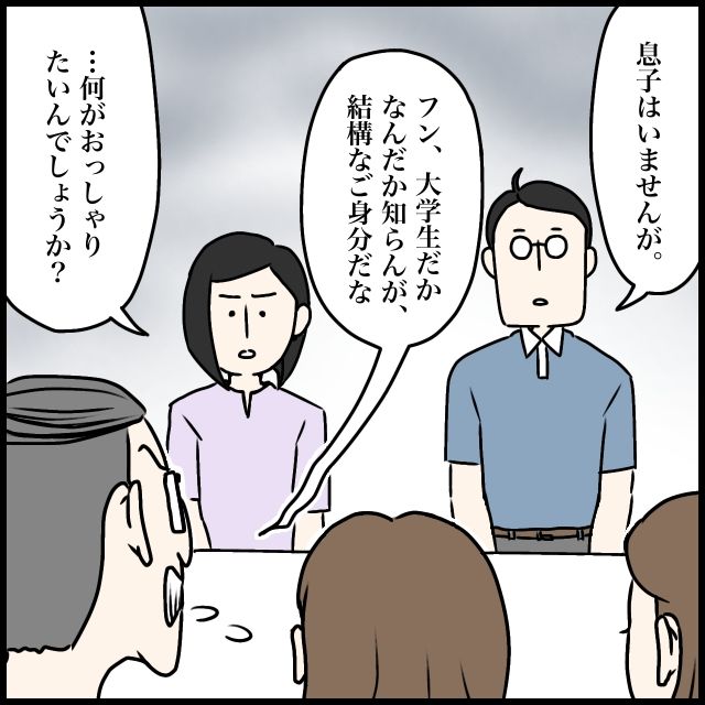 「息子はいませんが」冷静に答える夫に、「フン、大学生だかなんだか知らんが結構なご身分だな」皮肉を嫌な表情で言うきらりパパ。状況がつかめず「・・何がおっしゃりたいんでしょうか?」とたずねると、