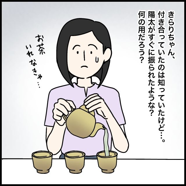 リビングに通しお茶を淹れながら、「きらりちゃん、付き合っていたのは知っていたけど・・。陽太がすぐに振られたような?何の用だろう?」と考え込んでいました。