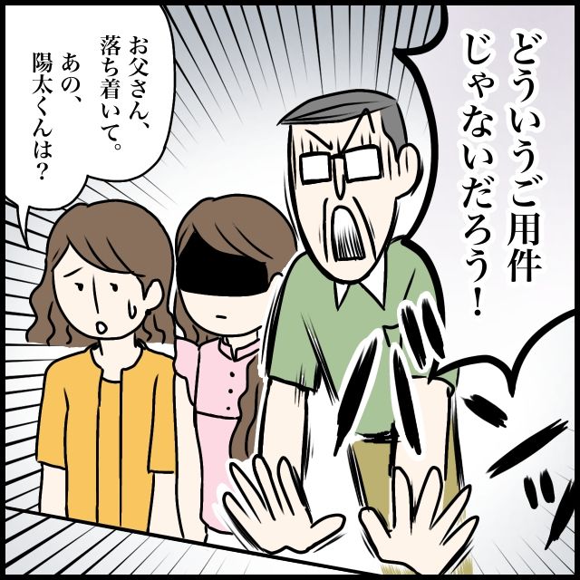 「どういうご用件じゃないだろう!」と大きな声を出し、テーブルを叩くきらりパパ・・。慌てて「お父さん、落ち着いて。あの、陽太くんは?」ときらりママが静かに言いました。