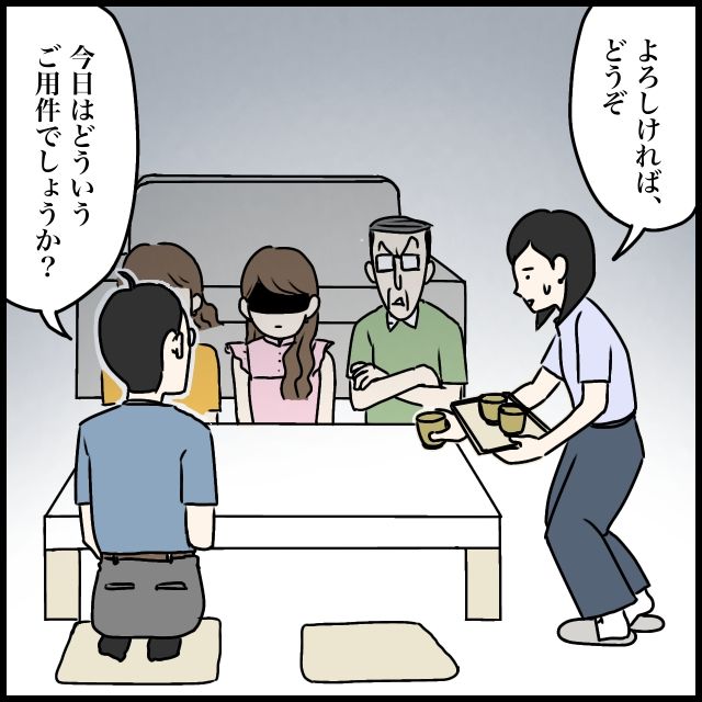 その後、「よろしければどうぞ」とお茶を出し、「今日はどういうご用件でしょうか?」夫がそう切り出すと、