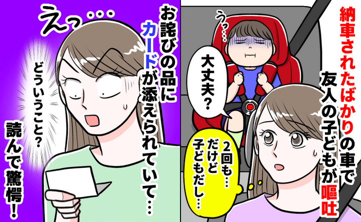 3. 納車したばかりの車内で友人の子どもが2回嘔吐…後日届いた“お詫びの品”とカードに驚愕したワケは?