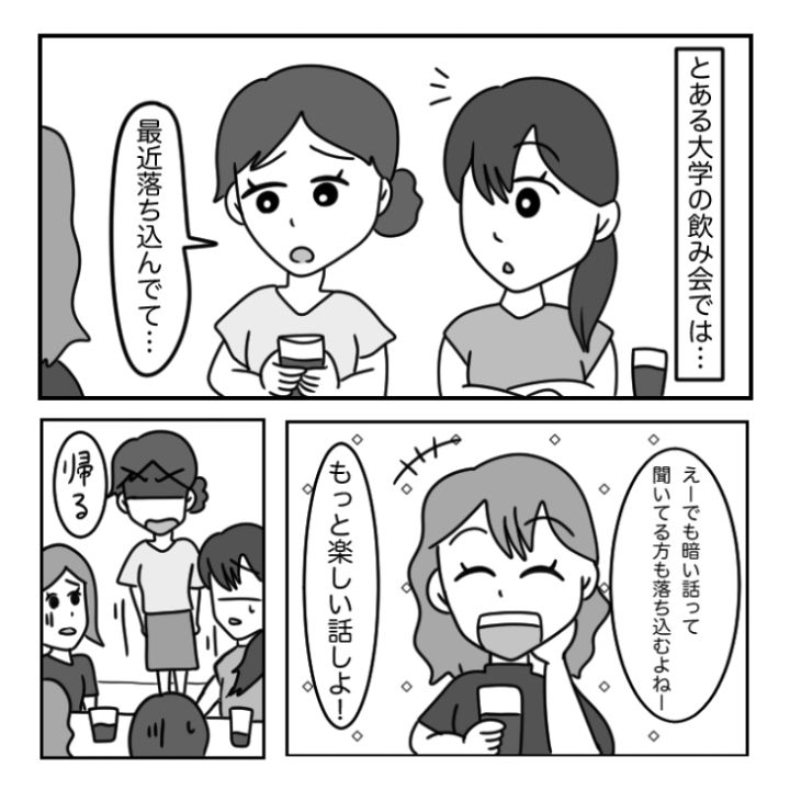 2. 「悩んでる」→「飲み会で暗い話されると嫌だから話変えて」空気が読めなさ過ぎて私以外の友達がいなくなった女!そんな私もフェードアウトすることになった事件は・・・