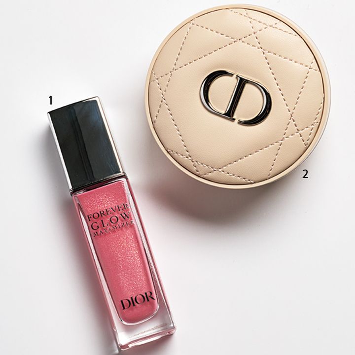 1.ツヤも血色も思いのままなリキッドハイライター。ディオールスキン フォーエヴァー グロウ マキシマイザー212 ¥5,940、2.粉っぽさや厚塗り感なく自然な透明感を肌に与えるルースパウダー。ディオールスキン フォーエヴァー クッション パウダー ラベンダー¥8,910(ともにパルファン・クリスチャン・ディオール)
