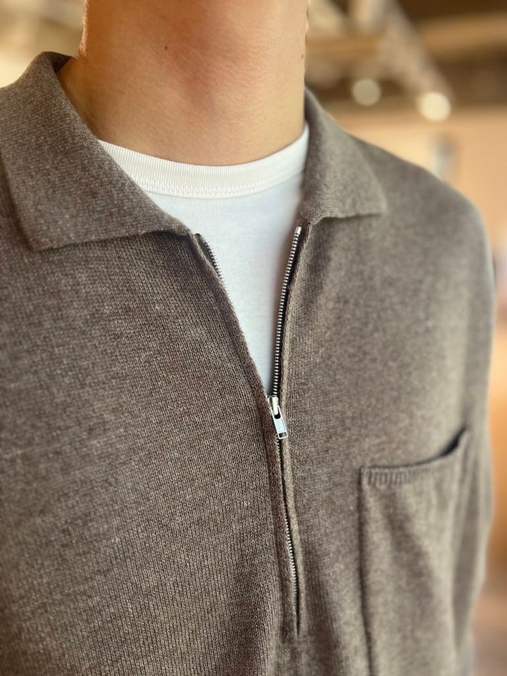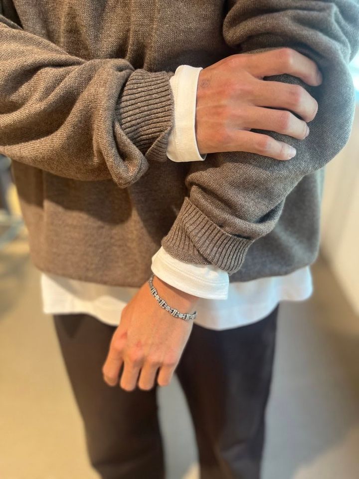 今シーズンはブラウンが一大トレンドになっていますが、それはメンズも同じ。清水さんも一番注目しているカラーだとか。「この秋はブラウンを着たい気分だったので、ニットもボトムスもブラウンで統一してみました。ニットは初秋らしくウール×リネンの混紡素材をチョイス。リネンは表情をより豊かにするだけでなく、所々に生まれるツヤのおかげで軽さを出るので、まさに今の時期に最適なんです」