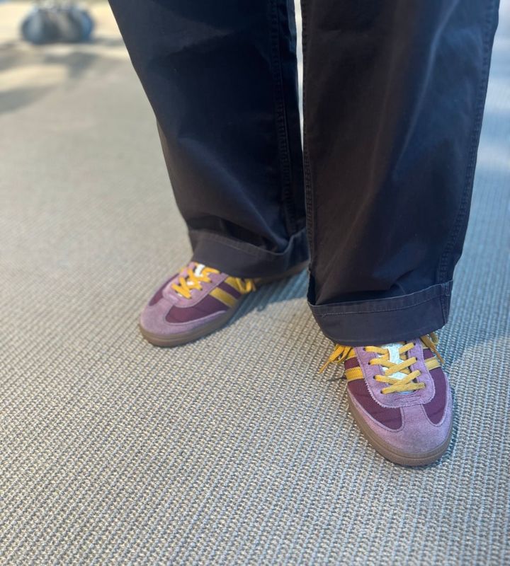 清水さんは「さつまいもカラー」といっていたパープル×イエローのスニーカーでも秋を意識。カジュアルなパンツの裾をさりげなくダブルに仕上げているのも新鮮!