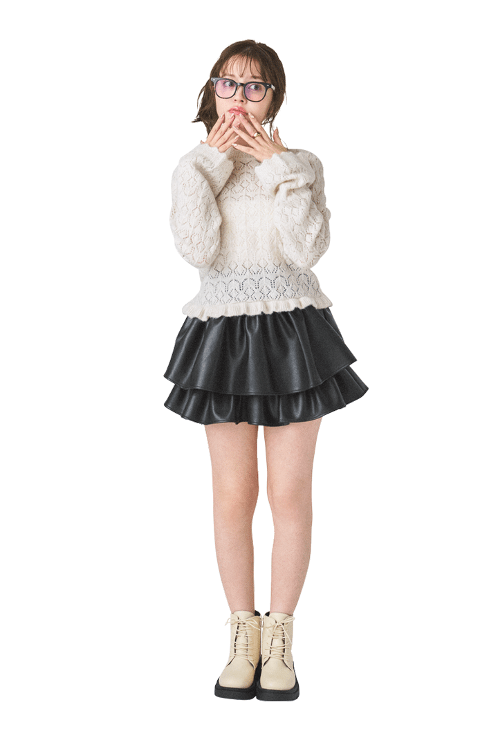 白フリルニット 2,999円/H&M レザーフリルスカート 10,890円/dazzlin めがね 13,000円/OWNDAYS リング 8,800円/89xiiitoky(850showroom)レースアップブーツ1,999円/GRL