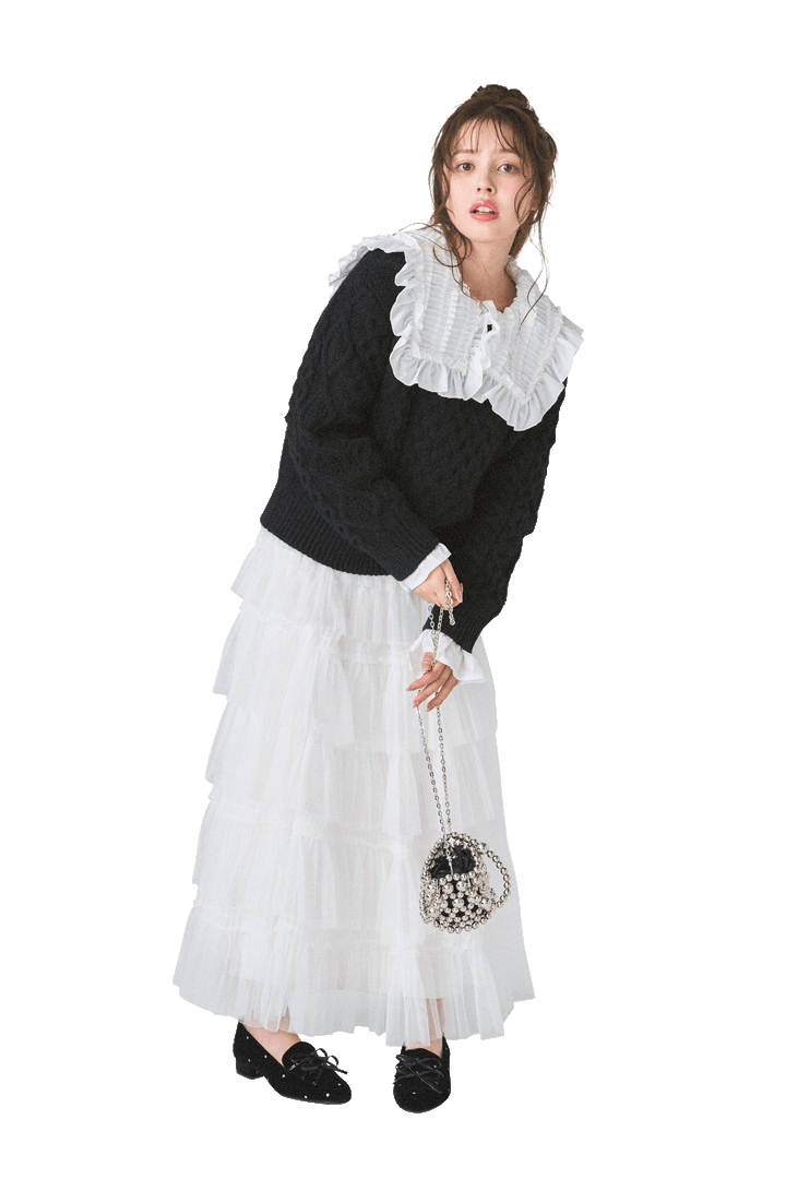 ケーブルニット(9月下旬発売予定)2,990円/GU BIGカラーシャツ 9,350円/merry jennyチュールカート 13,530円/JILL by JILL STUART ミニバッグ 6,490円/カシュカシュ(アンビリオン)フラットシューズ17,600円/ダイアナ(ダイアナ 銀座本店)