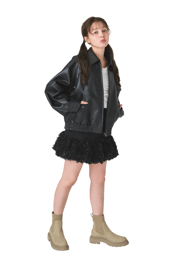 黒レザーブルゾン5,990円、サイドゴアブーツ3,990円/ともにGU 白ギャザートップス 9,900円/RESEXXY バラチュールスカート 19,800円/The Girls Society