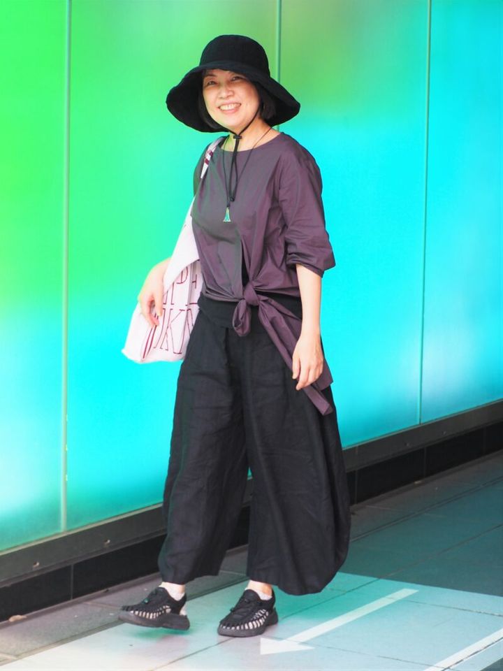 やや光沢のあるダークパープルのブラウスは、フロントを結んでウエストマーク。「サイドに空いている穴に通してリボンの長さを調節したり、自分の好みに合わせてアレンジを楽しんでいます」。シンプルなワイドパンツとも好バランス。「ザラ」のパンツは肌離れのいい素材で、残暑厳しい夏の終わりにも大活躍。