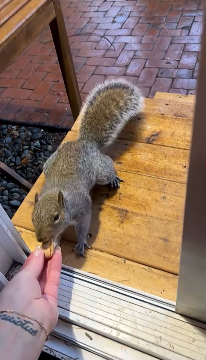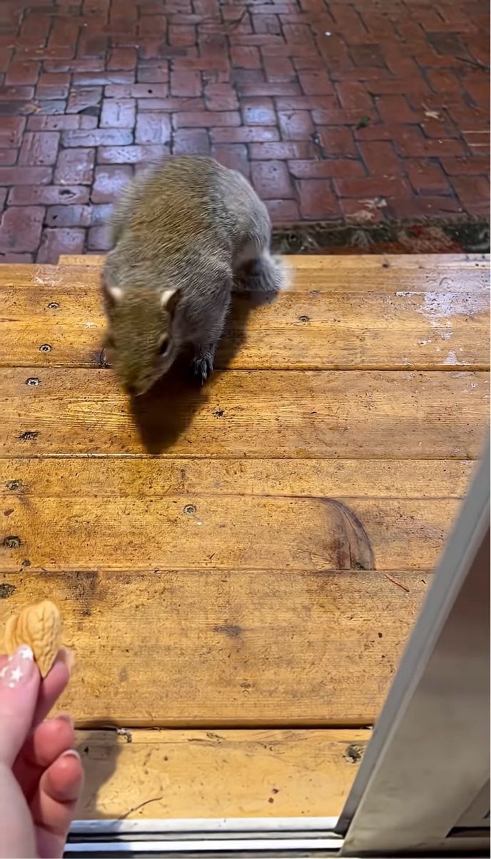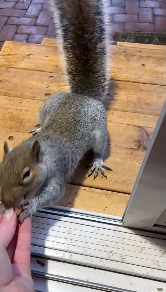 そこで、サッシを開けると、奥から別のリスがダッシュで駆け寄ってきました! 撮影者さんは、そんなリスにアーモンドをそっと手渡します。