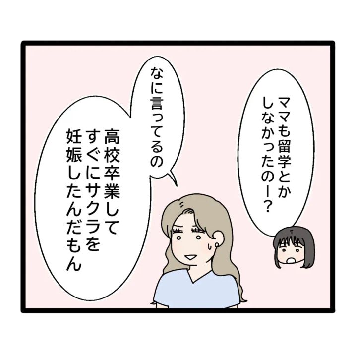 ルカさんへの憧れで頭がいっぱいのサクラから「ママも留学とかしなかったのー?」と聞かれ、「なに言ってるの。高校卒業してすぐにサクラを妊娠したんだもん」と答えた私。私が高校を卒業してすぐに妊娠出産したことはサクラも知ってるはずなのに・・。