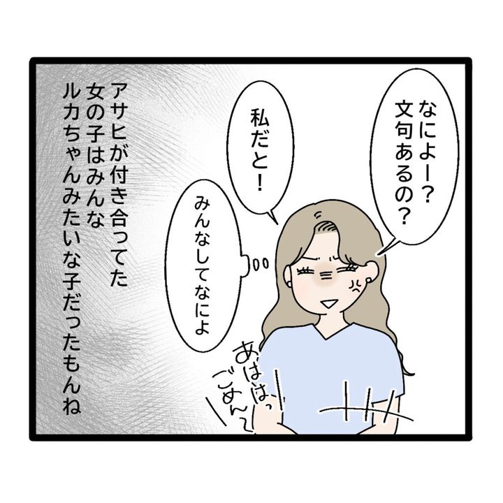 胸の痛みを顔に出すまいと、「なによー?文句あるの?私だと!」と笑いながら言うと、リョウは「ああははっごめん~」とおどけていました。みんなして「ルカさん」「ルカさん」って・・なによ。そういえば、アサヒが昔付き合ってた女の子はみんなルカちゃんみたいな子だったもんね。私はだんだんと腹が立ってきました。