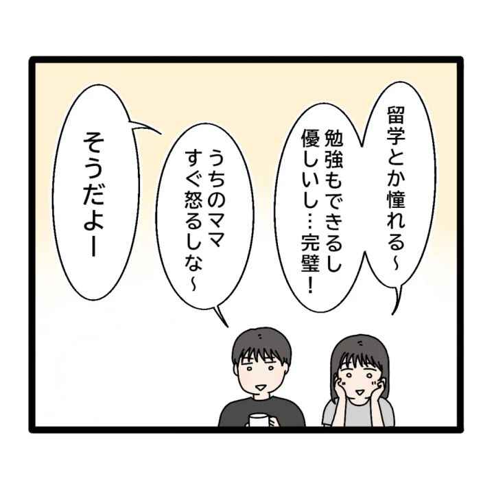「留学とか憧れる~。勉強もできるし優しいし・・完璧!」と目を輝かせるサクラ。リョウが「うちのママすぐ怒るしな~」と言うと、すぐにサクラが「そうだよー」と同調。