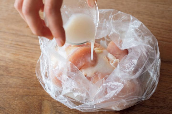 (1) 鶏肉を漬け込む