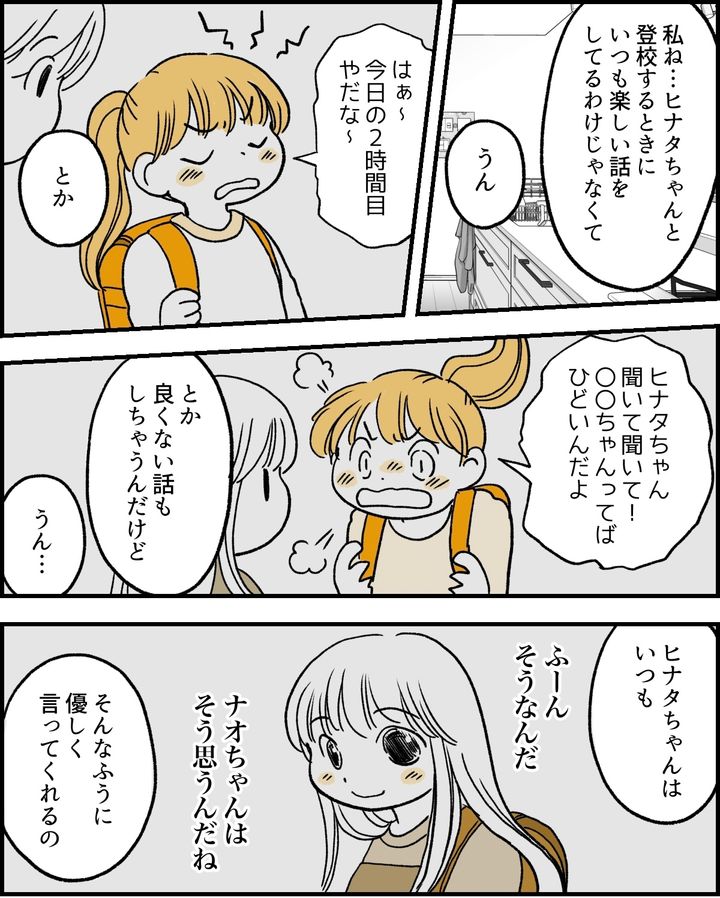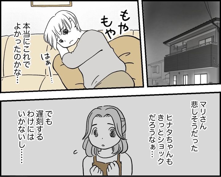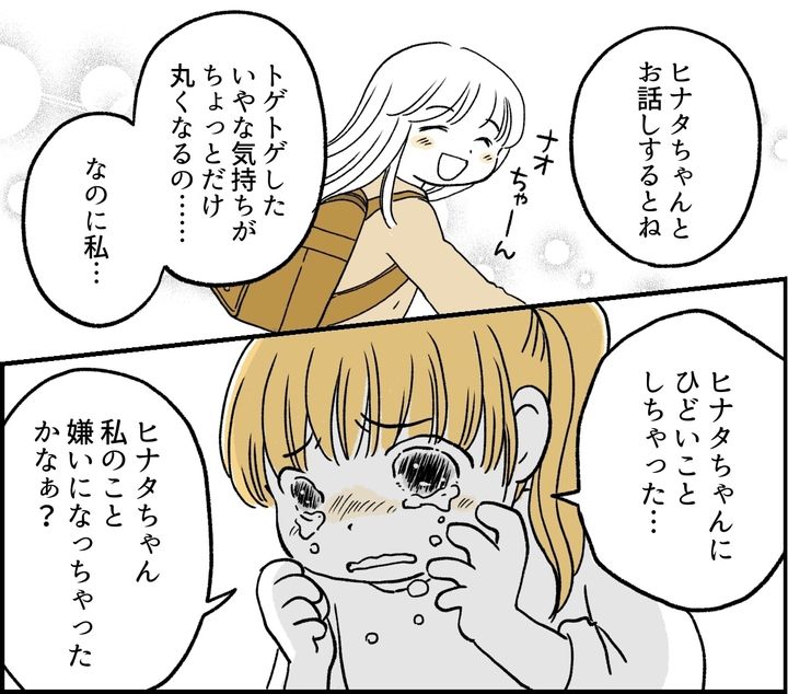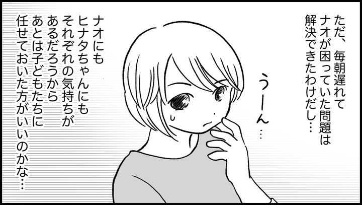 私はヒナタちゃんやマリさんを否定したかったのでしょうか。振り返ると、ナオはヒナタちゃんに対して悪意を持ったりいやがらせをしたわけではありませんし、もちろん私もナオとヒナタちゃんを引き離したいとは思っていません。遅刻するわけにはいかないし……と思ってのことでしたが、これでよかったのでしょうか。