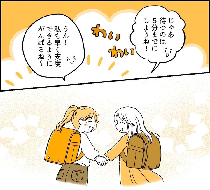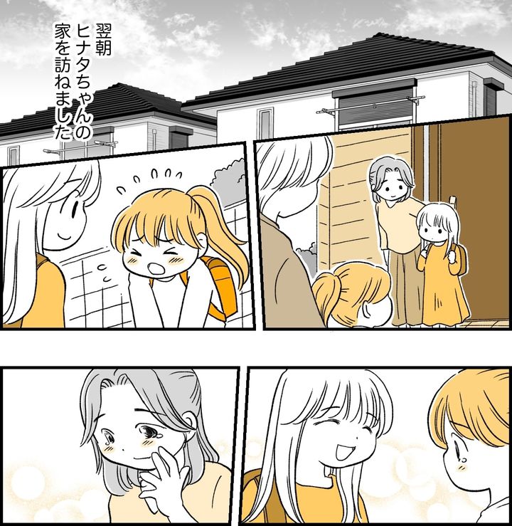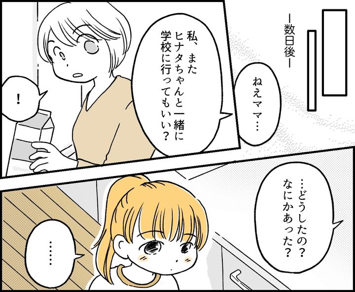 私はミツキ(30代)。夫のダイスケ(40代)と娘のナオ(小学2年生)との3人暮らし。私たちが住んでいる地域では登校班があり、朝は近隣の小学生が集まって登校します。その集合場所まで行く途中で、ナオは同級生のヒナタちゃんの家に寄るのです。そのヒナタちゃんがのんびりしていて困るとナオが言うので久しぶりに登校班まで一緒に行ってみると、ナオが遅刻しそうになっていることがわかりました。私はヒナタちゃんのママ、マリさんに「一緒に行くのはやめましょう」と提案しました。