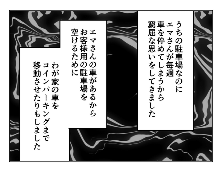ヒカリさんは、自宅の敷地内に義妹エマさんが毎週車を停めるので困っていました。「もう停めないで」と言ったにもかかわらず、またやってきたエマさん。「停めさせてくれたら将来親の介護は私がするから」とピントのズレた提案をしてきて、まだ停め続けようとします。それでもダメだとわかると、次はコインパーキング代を請求してきました。