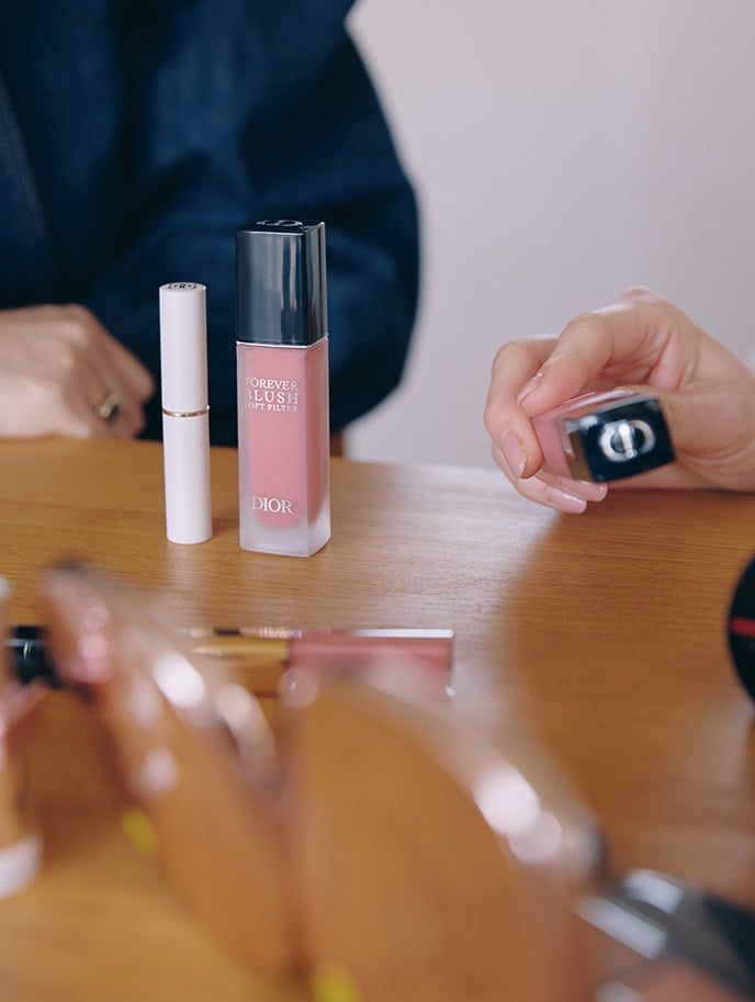 年齢を重ねると頰の位置が下がってくるので、チークを高く入れることで錯覚して見せられるんです。DIORのリキッド(1)は、たるみ毛穴もふんわりぼかしてくれる効果もあって、本当に優秀。