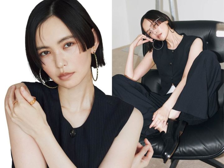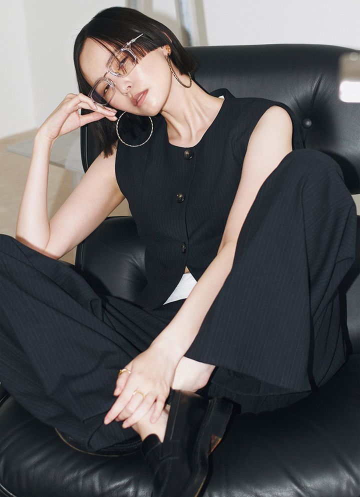 フープピアス[SIL]各¥114,400、ピアス※片耳[K22YG]¥159,500、親指のリング[K22YG]¥936,100、中指のリング[K22YG]¥356,400、眼鏡¥302,500(全てクロムハーツ/クロムハーツ トーキョー)、ベスト¥57,200、パンツ¥57,200(共にバウム・ウンド・ヘルガーテン/S & T)、ローファー¥198,000(ジェイエムウエストン/ジェイエムウエストン 青山店)