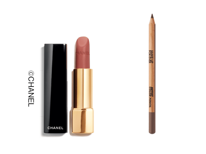 右から:4_滑らかな描き心地。アーティストカラーペンシル #506 エンドレスカカオ ¥3,080(メイクアップフォーエバー) 5_潤うしなやか質感。ルージュ アリュール ヴェルヴェット 77 アフランシー ¥6,270(シャネル・8月22日発売)