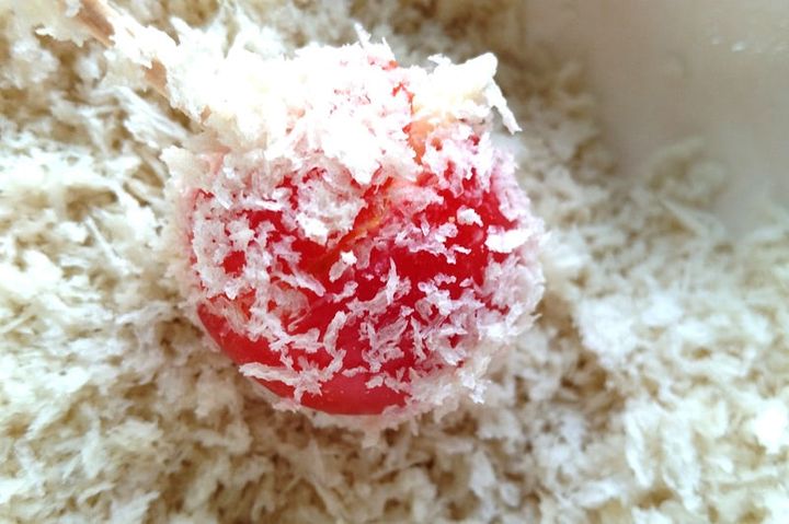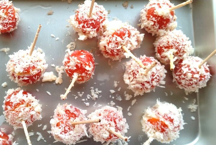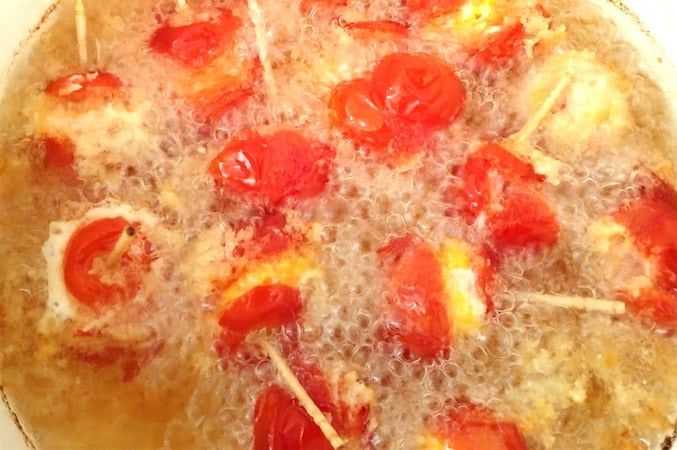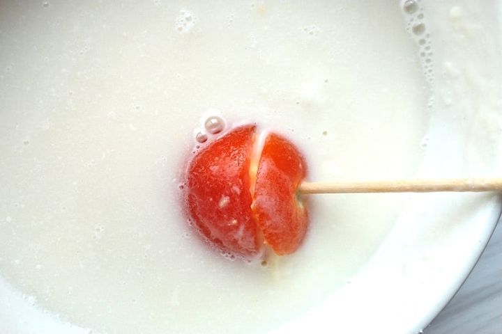 3. 定番の「ミニトマトの串揚げ」…と思いきや、中からは子どもが大好きなトロ~リ熱々のアレが出現♪【農家直伝】