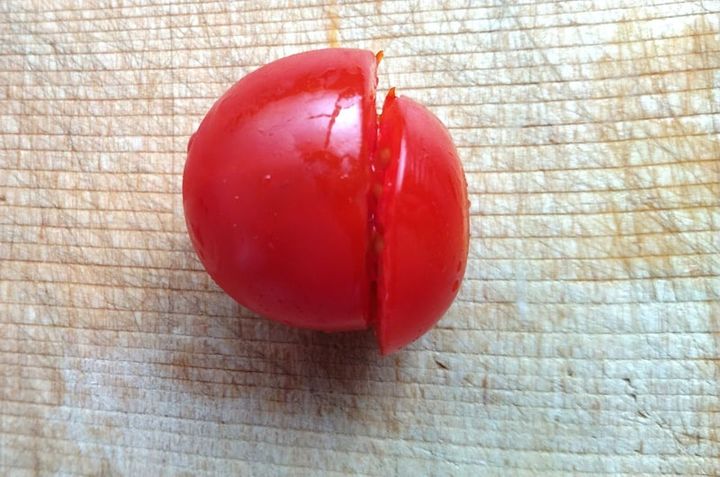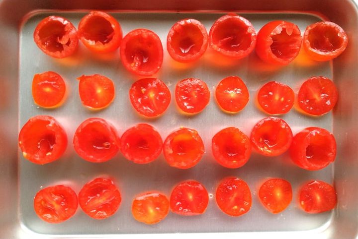3. ミニトマトはヘタを取って洗い、キッチンペーパーなどで水気を拭いて、ヘタ側の上部1/4を切る。切ったヘタ側も取っておく。