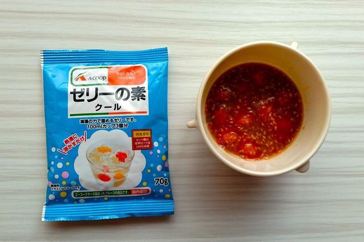 ミニトマトの中身に水を加えたので、ちょっと薄めの味を想像していましたが、意外にもトマトの風味をしっかり感じます。今回使ったゼリーの素は甘味がついているので、砂糖を加えなくても自然な甘さに仕上がっています。