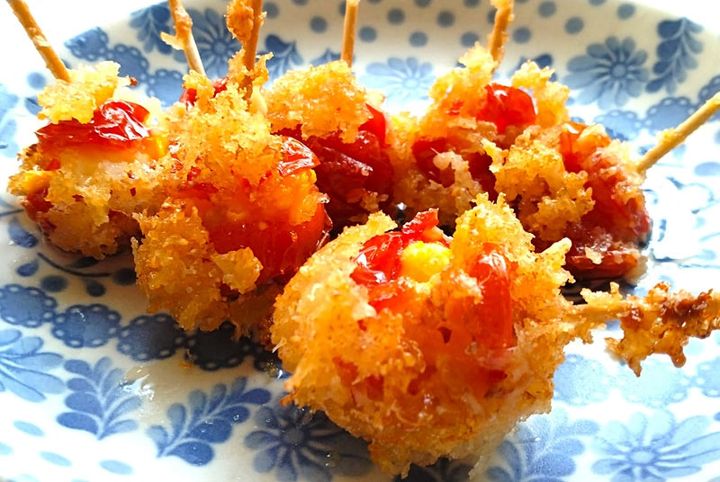 定番の「ミニトマトの串揚げ」…と思いきや、中からは子どもが大好きなトロ~リ熱々のアレが出現♪【農家直伝】