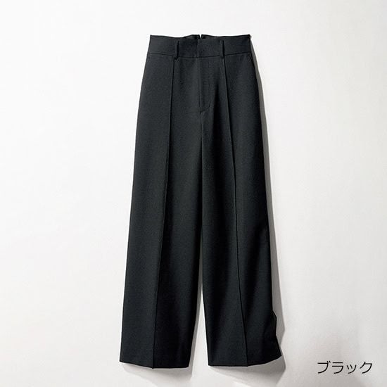 太すぎない絶妙シルエット、脚を立体的に見せるハリのある素材感、センターにくっきりと入ったピンタックの効果と超ハイウエスト、そんな計算されたデザインで脚をシュッと見せる最強の美脚ワイドストレートパンツ。キレイめで大人の品も漂うパンツは、どんなシーンにもフィットし、自信をくれる一本です。また、後ろウエストゴムで楽ちんなうえ、お尻をキュッと見せる高めのポケット位置もポイント。ドライタッチで着心地も良く、オールシーズン着られる素材感のうえ、イージーケアが叶うのも嬉しい。