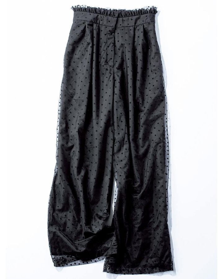 手に取りやすい黒の美シルエットパンツの上にドットのチュール素材を重ねた、大人もトキメク甘ニッシュなパンツ。ウエストはタック仕様にし、インしたときもスタイリングが単調にならないのが魅力。後ろウエストはゴムで便利なポケット付き。