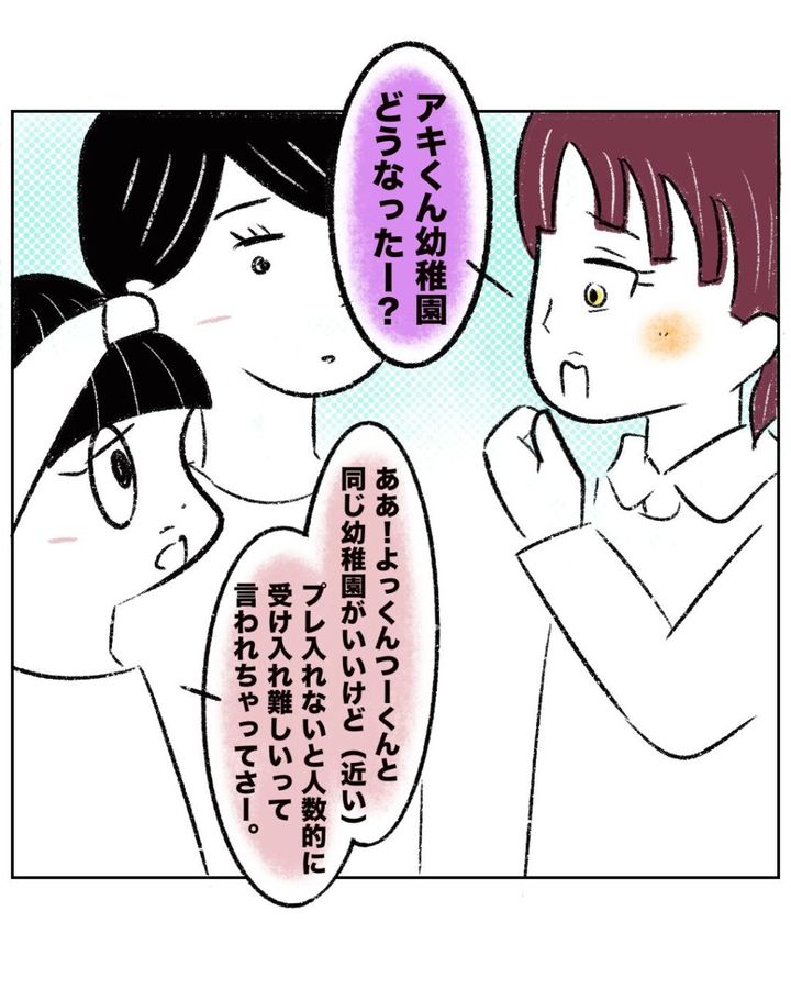 「アキくん幼稚園どうなったー?」とつーくんママに聞かれ、「あぁ。よっくん、つーくんと同じ幼稚園がいいけど、プレ入れないと人数的に受け入れ難しいって言われちゃってさー」と残念そうに答えるまるさん。