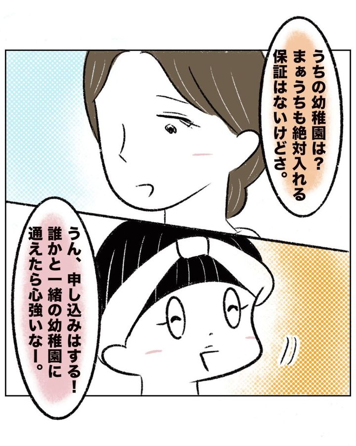 「うちの幼稚園は?まぁうちも絶対入れる保証はないけどさ」とまーくんママが声をかけてくれ、「うん、申し込みはする!誰かと一緒の幼稚園に通えたら心強いなー」と答えたまるさん。