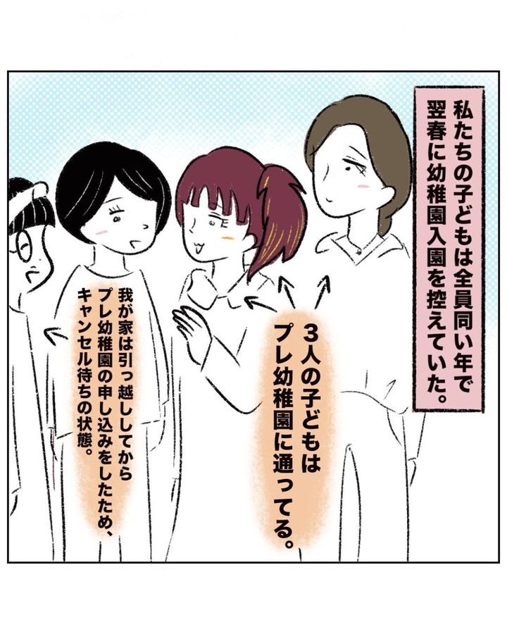 まるさん達の子どもは全員同い年で、翌春に幼稚園入園を控えていました。まーくん、よっくん、つーくんの3人はプレ幼稚園に通っていましたが、まるさんは引っ越してきてからプレ幼稚園の申込みをしたためキャンセル待ちの状態でした。