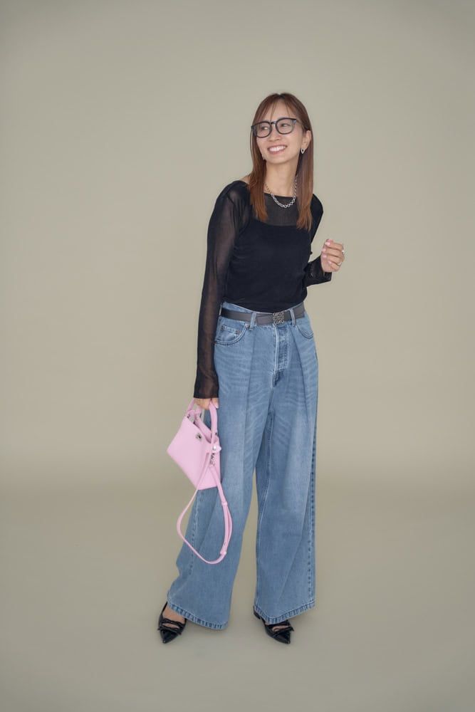 透け感のあるシアーベロアカットソーで秋を取り入れ、ワイドデニムでゆるっとラフなコーデに。そんなシンプルでカジュアルなコーデの時はメガネをかけて、おしゃれ度をアップします。簡単な用事を済ませたい日やメンテナンスdayのときなど、素顔感を出さないメガネに頼りながら差し色のピンクバッグを手に持ち、シンプルに小物が活きるコーデに仕上げてみました。