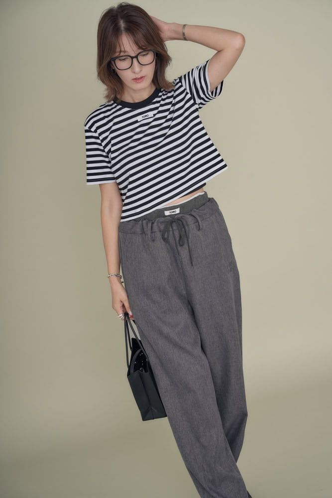トレンドのウエスト見せパンツにクロップド丈のボーダーTシャツを合わせた今っぽいカジュアルスタイルに。ウエスト部分にはブランドタグが付いていて、腕を動かすたびにチラ見えする可愛さ。そんなアクセントの効いたファッションに負けないモードスタイルに落とし込めるメガネを合わせました。大人の肌見せコーデもメガネをかければ、きちんと見え効果が期待できそう。