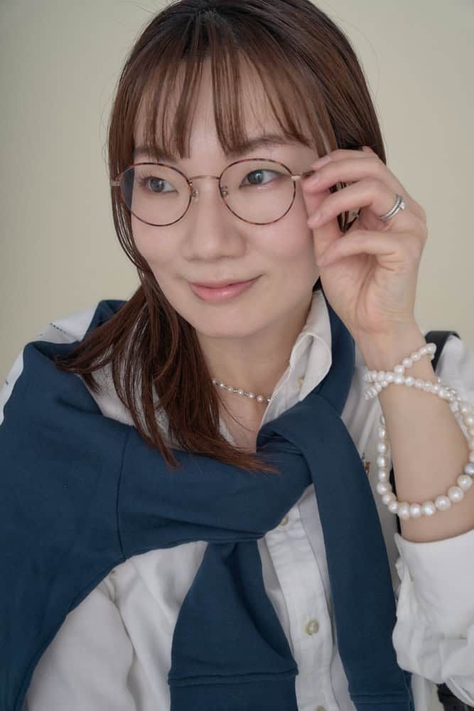 丸みのある柔らかいシルエットのメガネは、甘めカジュアルな私のスタイリングと相性よし! 大きめの丸いブラウンフレームが、柔らかく品のある印象を与えながら小顔効果も狙います。シンプルながら今どきなフレームなので「メガネ=真面目そう」という先入観を回避し、面長な私の顔にナチュラルに調和してくれます。