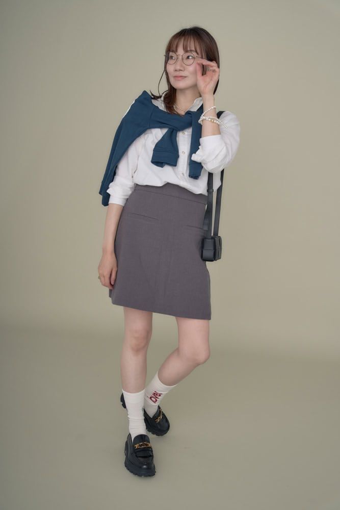 トラッドの定番、シャツとトレーナーにローファーでまとめ、アイコニックなオシャレメガネをアクセントにしました。初秋の心地よい空気感をまといながら足を見せるスタイルでシーズンムードを演出。上品さときちんと感のあるメガネをかければ、大人の余裕を残しつつ、40代のトラッドルックが楽しめます。