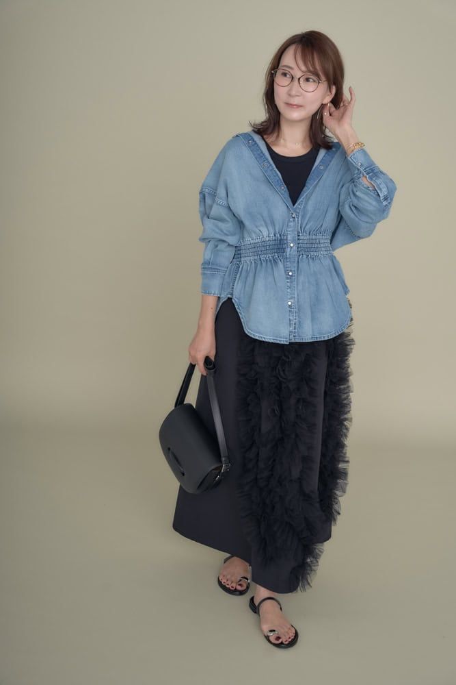 カジュアルなデニムシャツに甘さのあるチュールスカートと細フレームのメガネを合わせて“甘カジ”コーデに。9月はまだ暑さが残るので、着脱しやすいデニムシャツを合わせました。女性らしいシャーリングの入ったハイウエストラインがスタイルアップを叶えてくれ、華やかなディテールのチュールスカートをプラスすることで大人なカジュアルスタイルに。丸みがある細めのフレームメガネを合わせて柔らかい印象をプラスしました。