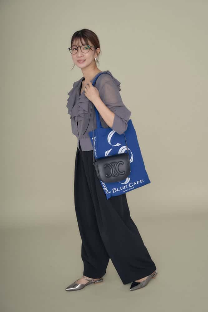襟元には大胆なフリルがあしらったブラウスで、甘さと華やかさを引き立てつつ、パンツとメガネで程よくバランスをとりました。メガネを添えるだけで甘さのあるコーデもきちんと顔モードに。大人で上品なビジネススタイルへアップデートしました。メガネのフレームが華奢なので、カジュアルファッションも大人上品へと導いてくれそう!