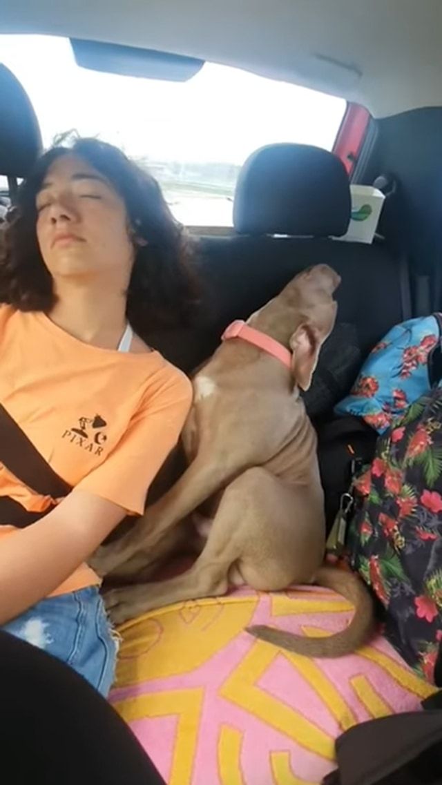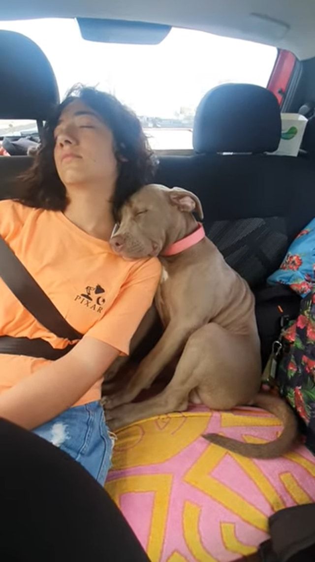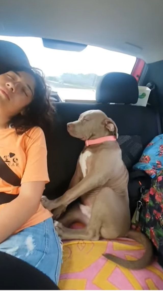 人間と犬という違いこそあれ、仲良く眠るふたりは正真正銘の姉妹。 お姉ちゃんは子犬を支えるように、子犬はお姉ちゃんを頼るようにいろんな体勢になってドライブ中のお昼寝を楽しんでいます。