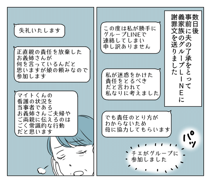 数日後、私は義家族とのグループLINEに謝罪文を送りました。そして、「私なりに責任のとり方を考えたがわからないため、母に協力してもらう」とも。その直後、母を義家族とのグループLINEに入れました。