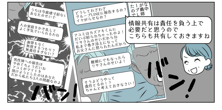 責任をとって絶縁すること、そして今後の連絡は夫にしてほしいことを伝え、私と母はグループLINEから抜けました。母のおかげで、強気で言うことができました。その後、義姉と義母からの連絡はありません。